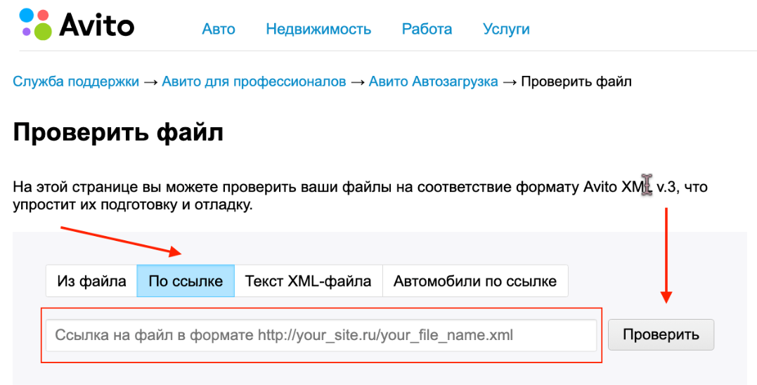 После генерации вы можете проверить XML на корректность, все ли правильно заполнено. Для этого перейдите по ссылке на сайт Авито: https://autoload.avito.ru/format/xmlcheck/